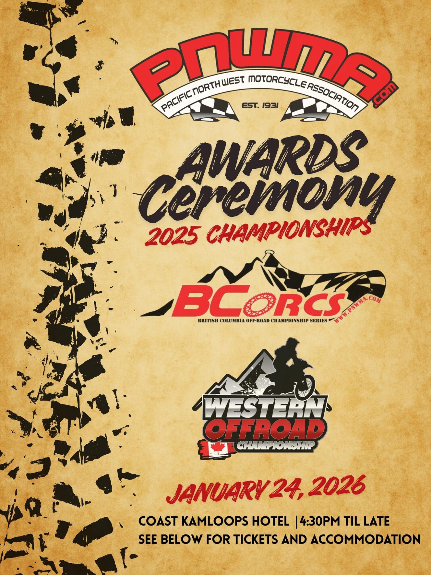2025 BCORCS AWARDS January 26th, 2026 -Â Kamloops, BC Jackets will be presented at the PNWMA BC Off-Road Championship Series Awards Night on January 26th 2026, at the Coast Kamloops Hotel & Conference Centre, Address: 1250 Rogers Way, Kamloops, BC More details to come!