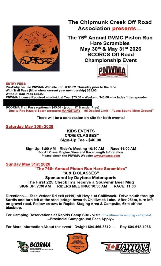 BCORCS R1 / BCORCS-C R1 - (A,B,C,D) The Greater Vancouver Motorcycle Club presents… The 76th Annual Piston Run Hare Scrambles May 30th & 31st, 2026 BCORCS Off Road Championship Event