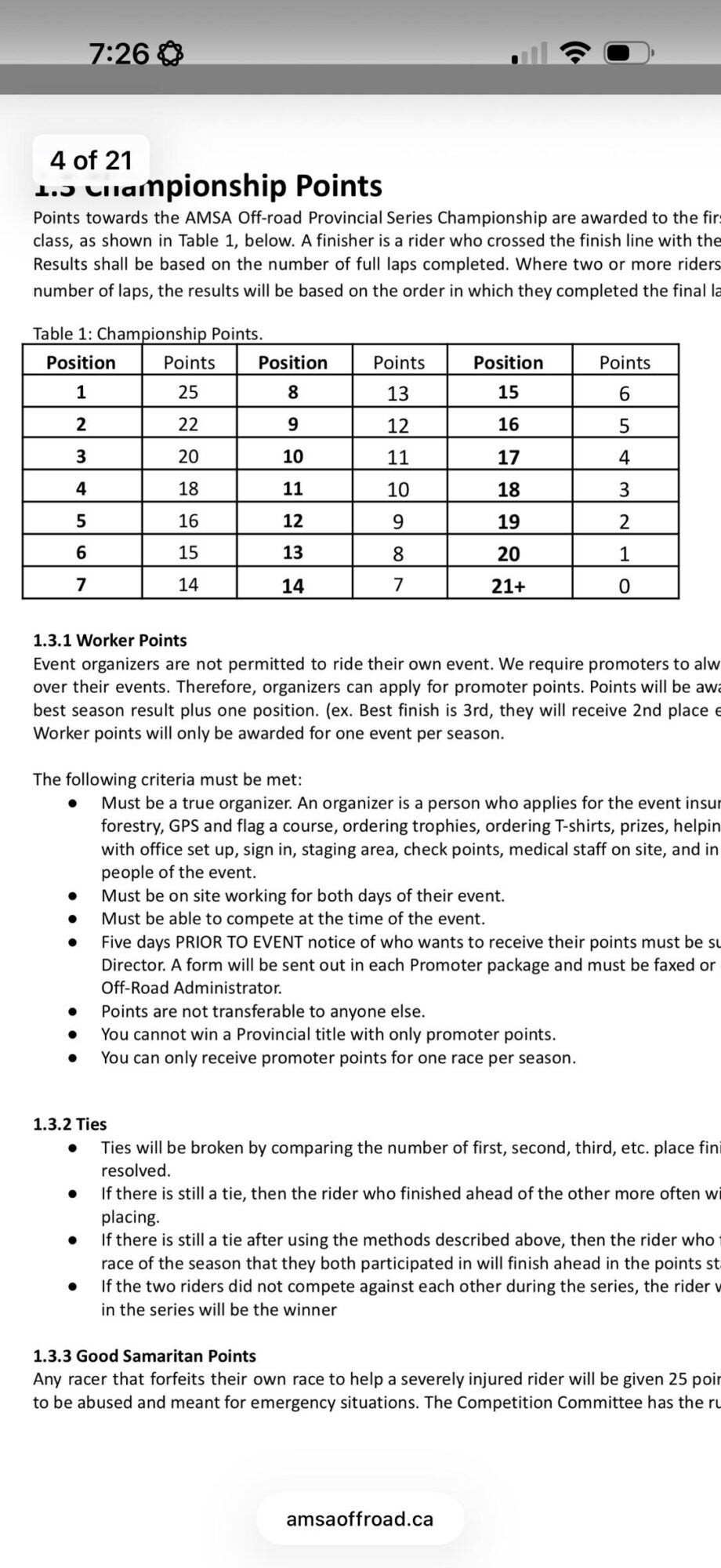 Point alignment with other race series: – some favourable response to this in the email thread – Ken suggests we actually check the metrics to see how this change would have affected the last few years results, to see if it even creates different results. – discussion on informing racers and having a poll. – plan is for Brian to get something together by email for everyone getting informed and we can vote on it March 18th, we could implement it this season if desired. Brian- Sara- Changing the points would increase the participation as there is a tighter gap between leaders. Wayne- Reward for 1st is not as important. The 30 Points for first makes you push Ken- Both systems are normal around the world. They create different incentives and wouldn’t really change anything Matt- Would tighten up the race SARA- 9 Races so no throwaways Christine- Everyone seems very excited and it was a hot topic at the awards Carla- First Place is more of a reward with the current system Christine- second, third, forth would be more competitive to whom gets on the podium. KATIE- AMSA Point system in favor Damien- Would be way more fun for who’s in the front. People who are going to win they are going to win Julie- We still had 12-15- 18 till the end of the race Christine- Racers seemed very jacked up thinking that they would do much better. Sara- More reward for first—more competitive environment, proponent of matching other race series to create congruency. Rules are already set for 2026 this discussion would need to be addressed during the AGM AMA does 25 AMA Motorcross does the 30 NMA -30 Points All agree to keep talking about it. And address again in the AGM.