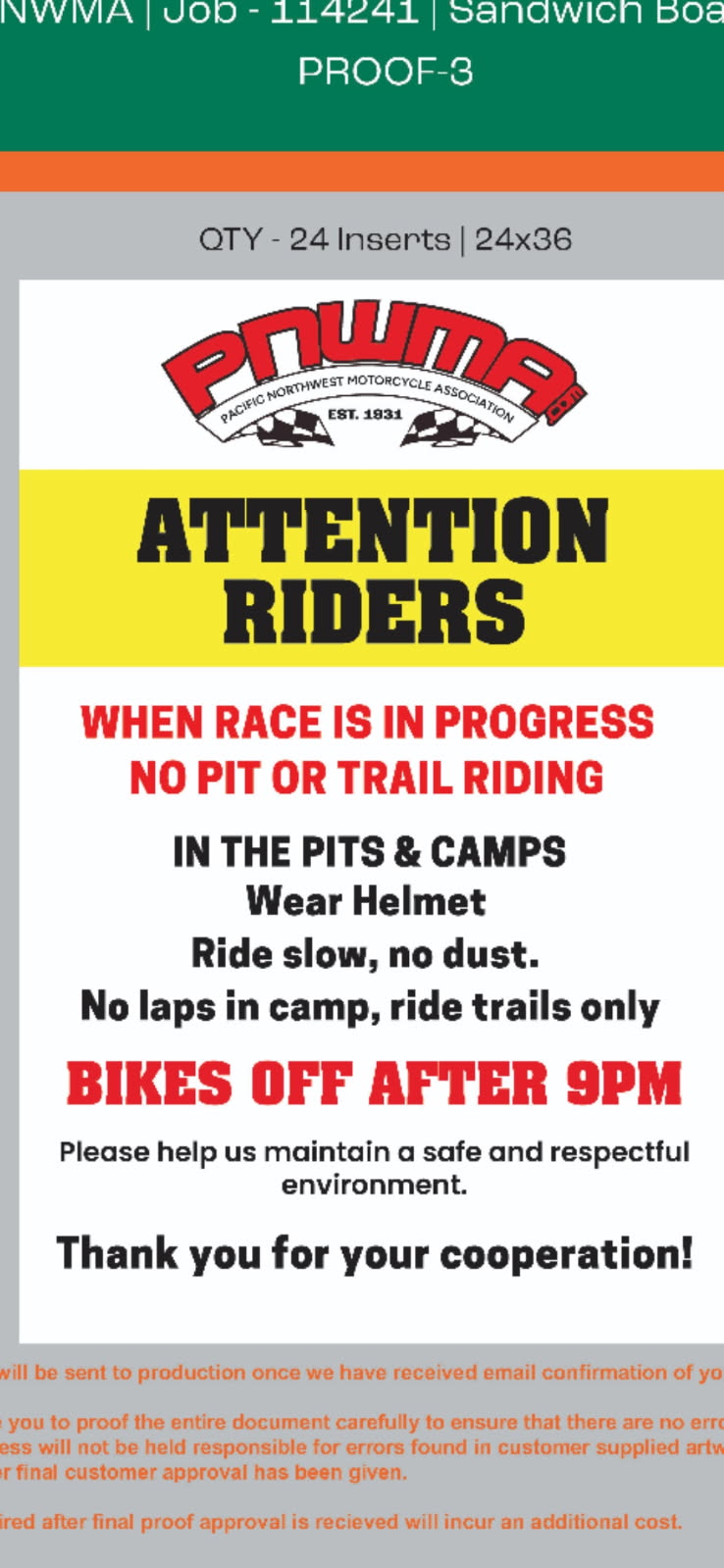 Equipment Purchase – sign boards (Reflective 2ft x 3ft). Voted for the race guidelines sandwich board printing budget, Content wording still to be finalized. The artwork was reviewed by Sara, Jane and Brian and brought to the board for final approval.Approved by 4 directors . It is reflective.Being done by MinuteMan Final amount $1,788.84 for 12 units.Final approved version of the proof: |
