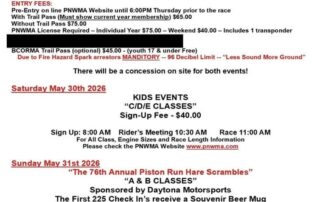 Hosted by the Squamish Dirt Bike Association PNWMA BCORCS round 1 WESTERN OFF-ROAD CHAMPIONSHIP ROUND 1 Location: Cat Lake, BC Join us for a weekend of off-road racing, hill climb action, and good times with the community! Race Schedule: Saturday, April 12 – C + D Classes ($40 Entry) [...]